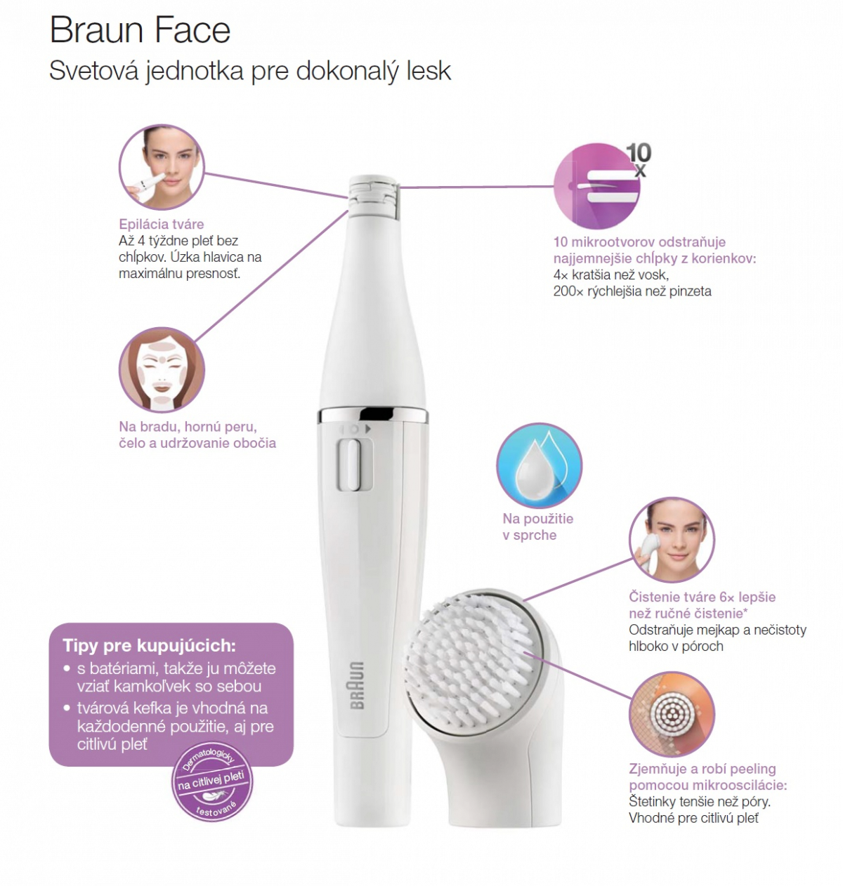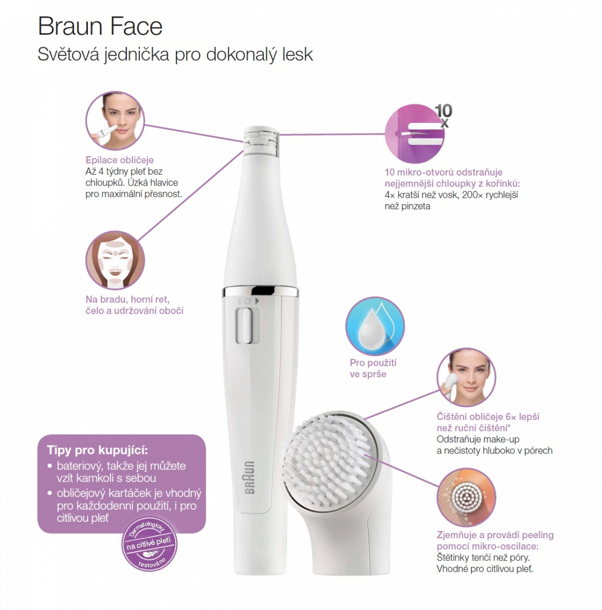 Inovovaná edice se 4 čisticími kartáčky uvnitř balení! Obličejový kartáček vyčistí pleť 6× lépe než manuální čistění. Štíhlá hlava epilátoru pro absolutní přesnost v oblastech čela, obočí, horního rtu, brady nebo krku. Díky 10 mikrootvorům a 200 mikrooscilacím za sekundu zachytí Braun Face i nejjemnější chloupky (do 0,2 mm).Technologie Wet&Dry umožňuje používat přístroj pohodlně ve sprše. Vhodné i pro citlivou pleť a každodení používání. Testováno dermatology.