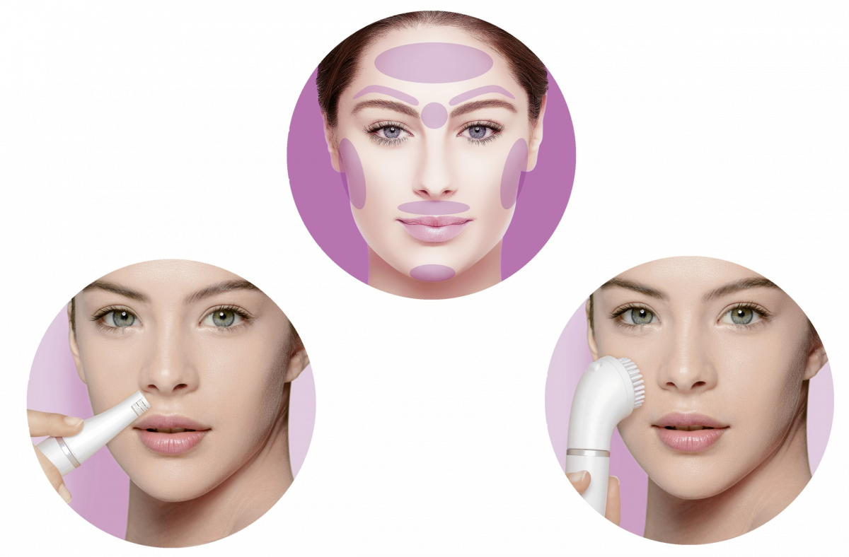 4 čisticí kartáčky (pro normální a pro citlivou pleť, exfoliační kartáček a houbičku pro nanášení krému či make-upu).