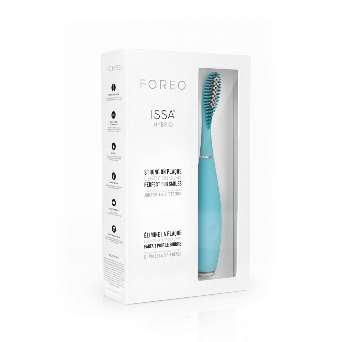 FOREO představuje nejmodernější elektrický zubní kartáček Issa™ Hybrid, který díky unikátní technologii Sonic Pulse v kombinaci s jedinečným designem a hlavou kartáčku, která kombinuje silikon a PBT polymer, perfektně odstraňuje zubní plak a skvrny. Zároveň předchází vzniku zubního kamene a kazů. Kartáček na zuby je ideální pro citlivé dásně a zuby, silikonová vlákna dásně jemně masírují, nedráždí je a nepoškozují zubní sklovinu.Kartáček na zuby Issa™ Hybrid vytváří až 11 000 kmitů vysoké intenzity za minutu. Účinně a šetrně čistí zuby a dásně. Je vyrobený z rychleschnoucího, neporézního a hladkého silikonu, a proto v porovnání s běžným nylonovým kartáčekem výrazně lépe odolává bakteriím.