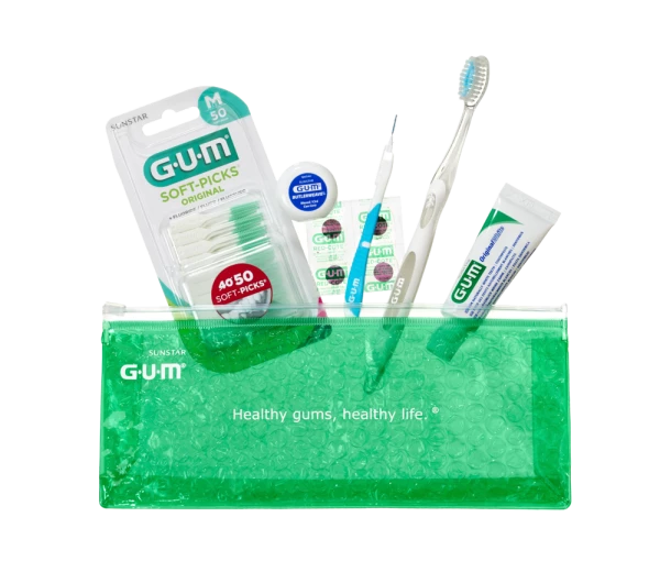 Na cesty s dokonalou péčí o zuby a dásně. Naše praktická cestovní sada GUM v zelené bublinkové taštičce obsahuje vše, co potřebujete pro zdravý úsměv a život.