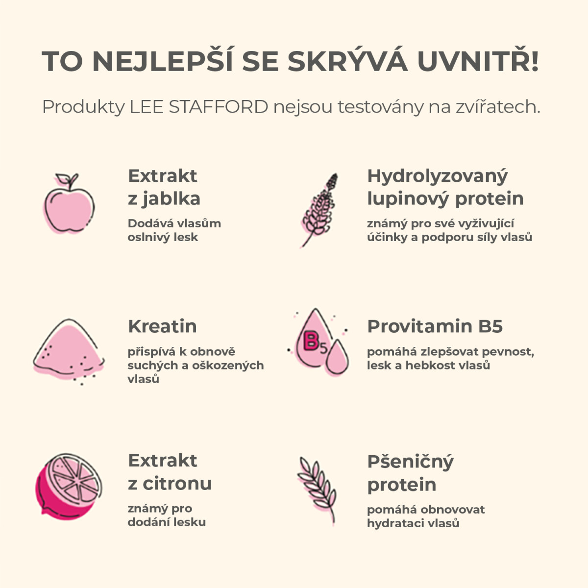 • provitamin B5 – posiluje vlasy, změkčuje je a propůjčuje jim krásný lesk.