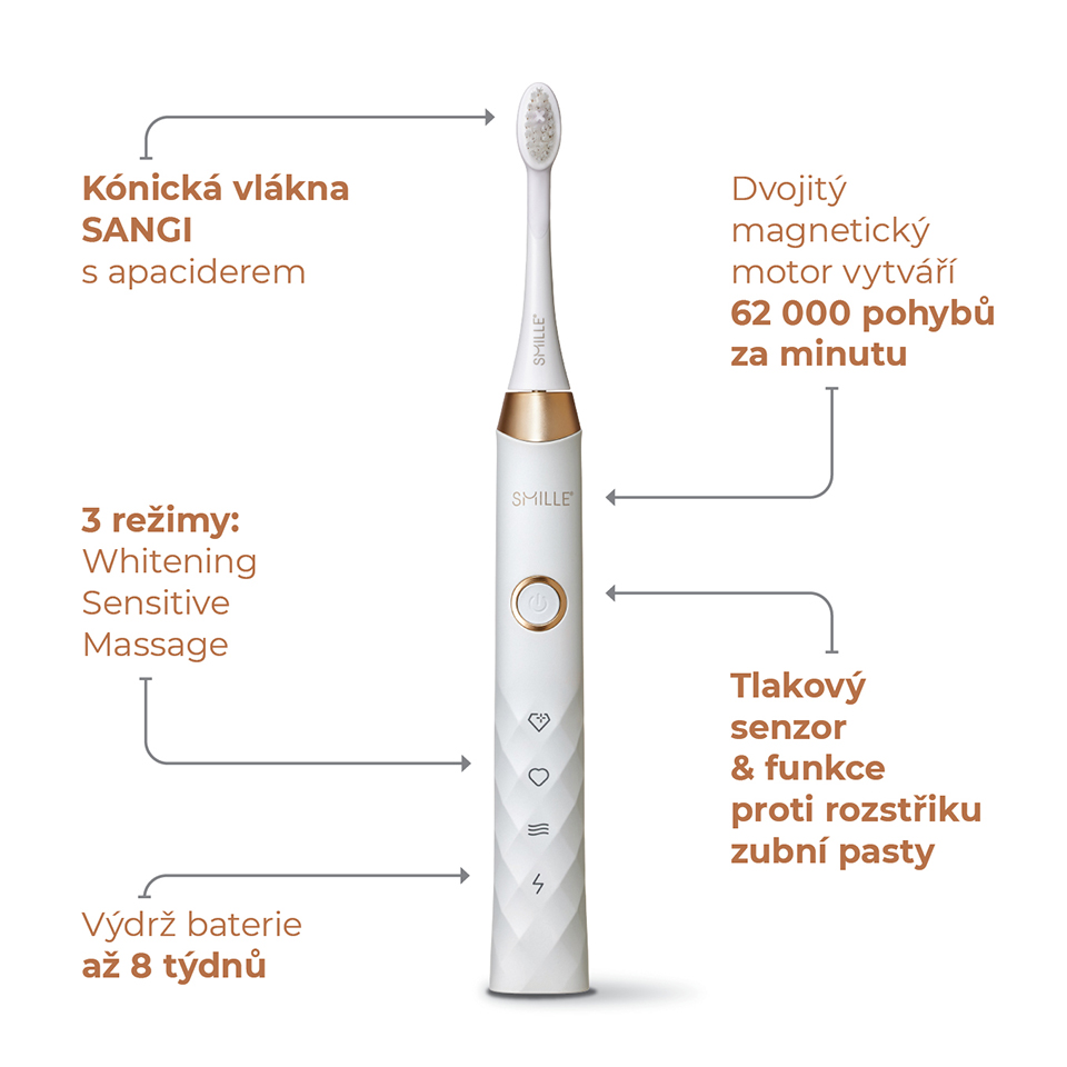 Smille zubní kartáček šetrně čistí zuby, ve třech variantách, dobře padne do ruky, je vybaven časovačem, příslušenstvím, stojánkem, kabelem a nabíječku, výdrž baterie dlouhá, dárkové balení, účinnost čištění zubů sonickym zubním kartáčkem je dobrá, vyčistí i mezizubní prostory, přidala bych na rychlosti v daném čase
